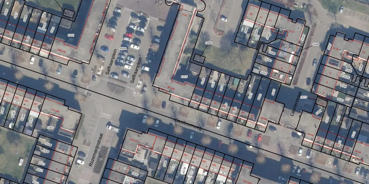 Basilicumweg 100 is gelegen op kadastraal perceel AMR04O6315. Deze kadastrale aanduiding is uniek en wordt gebruikt door het Kadaster om eigendomsrechten en andere zakelijke rechten vast te leggen. Het perceel maakt onderdeel uit van de kadastrale gemeente Almere.