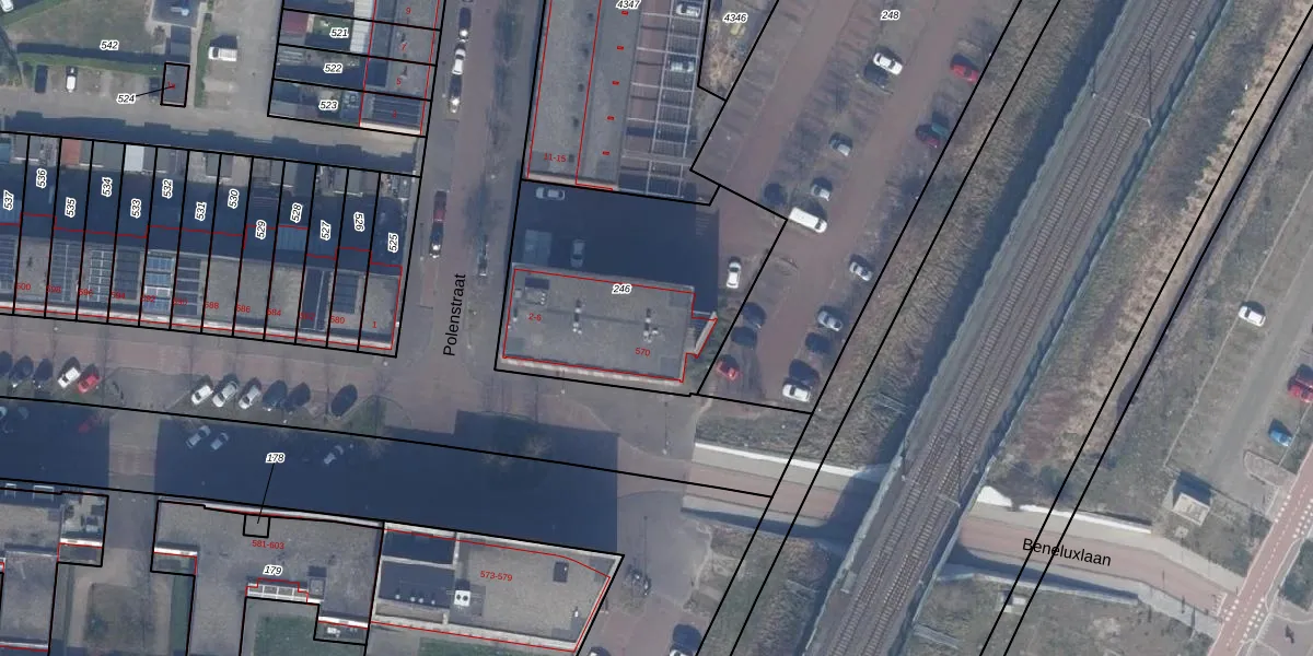 Beneluxlaan 570 is gelegen op kadastraal perceel AMR04W246. Deze kadastrale aanduiding is uniek en wordt gebruikt door het Kadaster om eigendomsrechten en andere zakelijke rechten vast te leggen. Het perceel maakt onderdeel uit van de kadastrale gemeente Almere.