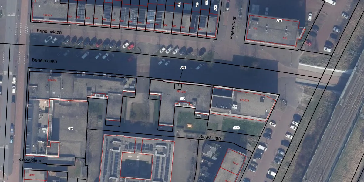 Het perceel waarop Beneluxlaan 603 staat heeft een oppervlakte van 568 m². Dit is een groot perceel. De perceeloppervlakte wordt geregistreerd door het Kadaster. Gedetailleerde informatie over de maten van dit perceel kunt u vinden in het rapport Kadastrale kaart met maatvoering van Beneluxlaan 603.