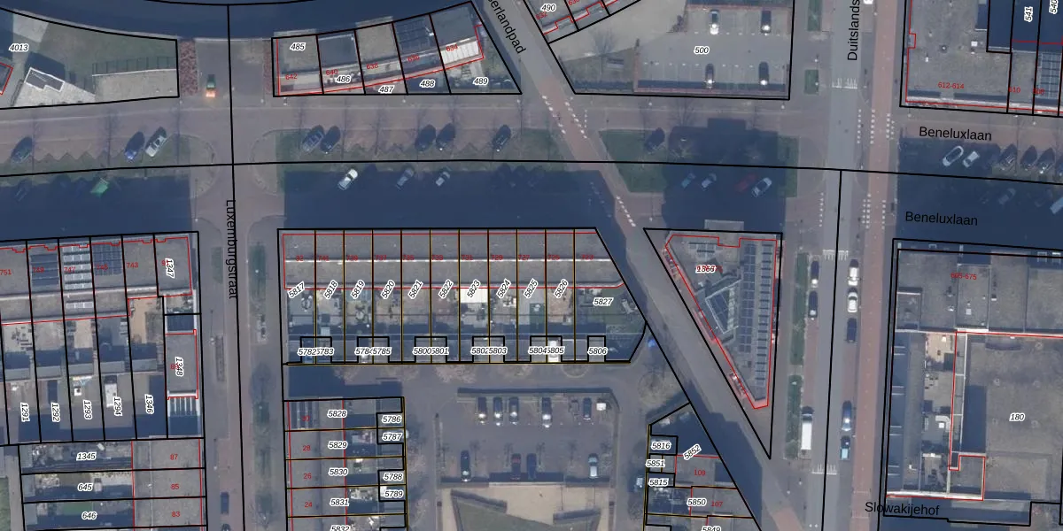 Het perceel waarop Beneluxlaan 727 staat heeft een oppervlakte van 123 m². Dit is een middelgroot perceel. De perceeloppervlakte wordt geregistreerd door het Kadaster. Gedetailleerde informatie over de maten van dit perceel kunt u vinden in het rapport Kadastrale kaart met maatvoering van Beneluxlaan 727.