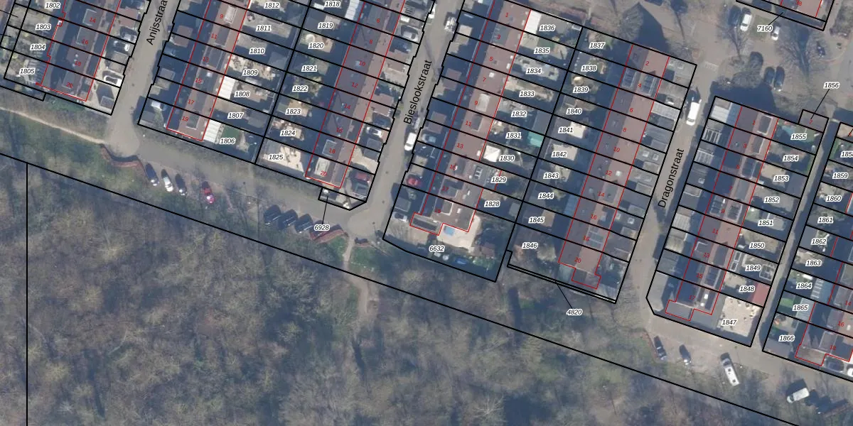 Het perceel waarop Bieslookstraat 19 staat heeft een oppervlakte van 411 m². Dit is een groot perceel. De perceeloppervlakte wordt geregistreerd door het Kadaster. Gedetailleerde informatie over de maten van dit perceel kunt u vinden in het rapport Kadastrale kaart met maatvoering van Bieslookstraat 19.