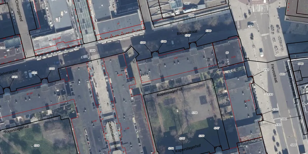 Blekerstraat 67 is gelegen op kadastraal perceel AMR04K5787. Deze kadastrale aanduiding is uniek en wordt gebruikt door het Kadaster om eigendomsrechten en andere zakelijke rechten vast te leggen. Het perceel maakt onderdeel uit van de kadastrale gemeente Almere.