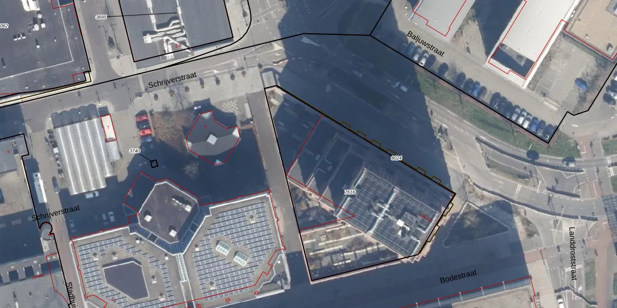 Het perceel waarop Bodestraat 221 staat heeft een oppervlakte van 2046 m². Dit is een zeer groot perceel. De perceeloppervlakte wordt geregistreerd door het Kadaster. Gedetailleerde informatie over de maten van dit perceel kunt u vinden in het rapport Kadastrale kaart met maatvoering van Bodestraat 221.