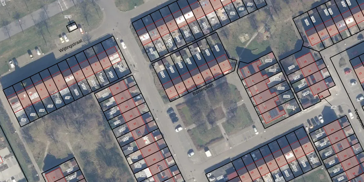 Het perceel waarop Bonietplein 2 staat heeft een oppervlakte van 126 m². Dit is een middelgroot perceel. De perceeloppervlakte wordt geregistreerd door het Kadaster. Gedetailleerde informatie over de maten van dit perceel kunt u vinden in het rapport Kadastrale kaart met maatvoering van Bonietplein 2.