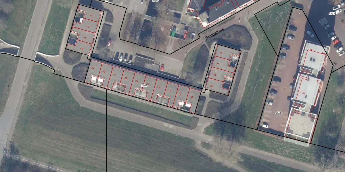 Het perceel waarop Boogstraat 32 staat heeft een oppervlakte van 1877 m². Dit is een zeer groot perceel. De perceeloppervlakte wordt geregistreerd door het Kadaster. Gedetailleerde informatie over de maten van dit perceel kunt u vinden in het rapport Kadastrale kaart met maatvoering van Boogstraat 32.