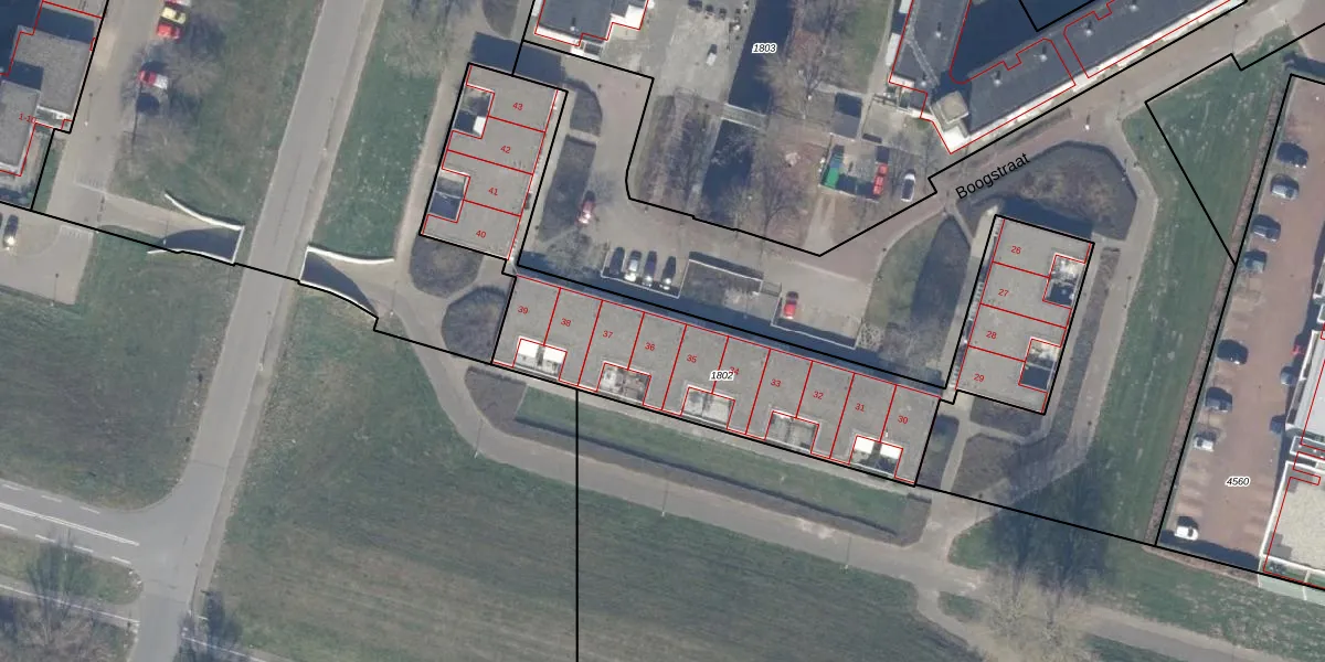 Boogstraat 36 is gelegen op kadastraal perceel AMR04H1802. Deze kadastrale aanduiding is uniek en wordt gebruikt door het Kadaster om eigendomsrechten en andere zakelijke rechten vast te leggen. Het perceel maakt onderdeel uit van de kadastrale gemeente Almere.