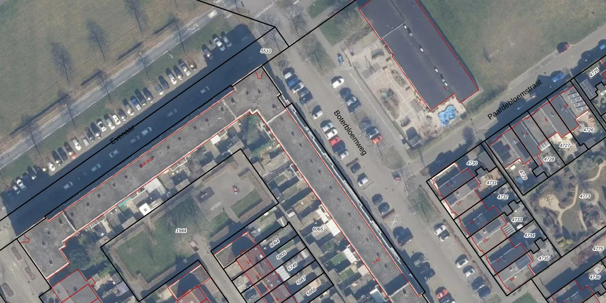Boterbloemweg 4 is gelegen op kadastraal perceel AMR04N6065. Deze kadastrale aanduiding is uniek en wordt gebruikt door het Kadaster om eigendomsrechten en andere zakelijke rechten vast te leggen. Het perceel maakt onderdeel uit van de kadastrale gemeente Almere.