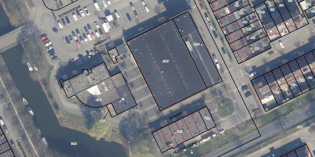 Het perceel waarop Botplein 15 staat heeft een oppervlakte van 1627 m². Dit is een zeer groot perceel. De perceeloppervlakte wordt geregistreerd door het Kadaster. Gedetailleerde informatie over de maten van dit perceel kunt u vinden in het rapport Kadastrale kaart met maatvoering van Botplein 15.