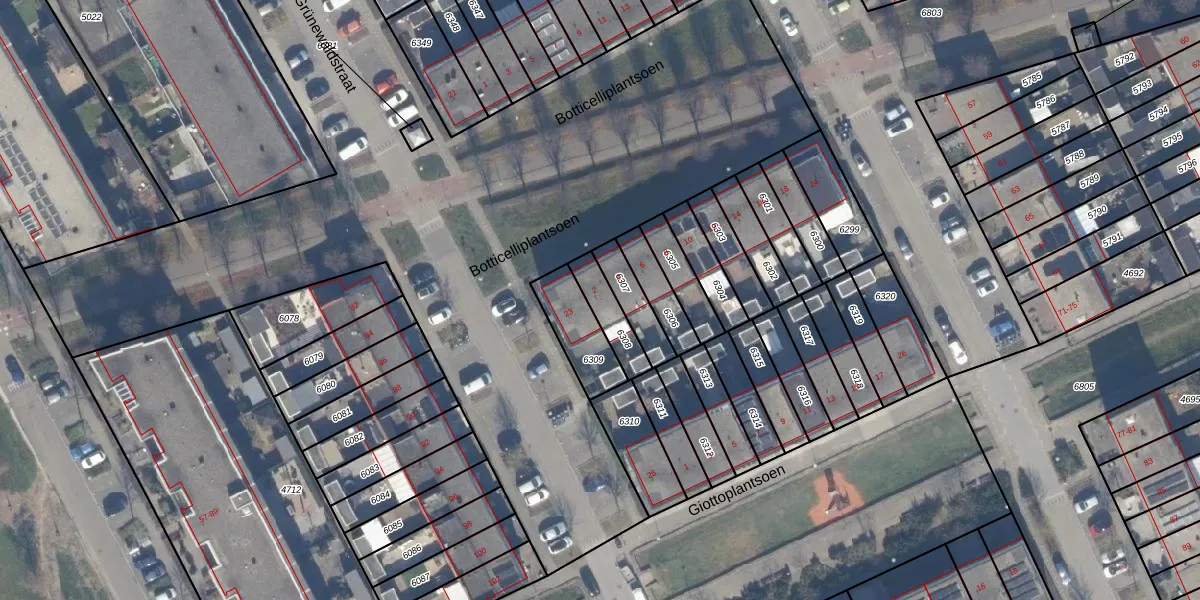 Het perceel waarop Botticelliplantsoen 2 staat heeft een oppervlakte van 99 m². Dit is een klein perceel. De perceeloppervlakte wordt geregistreerd door het Kadaster. Gedetailleerde informatie over de maten van dit perceel kunt u vinden in het rapport Kadastrale kaart met maatvoering van Botticelliplantsoen 2.