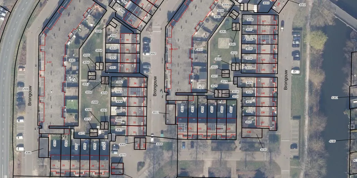 Het perceel waarop Brongouw 118 staat heeft een oppervlakte van 1578 m². Dit is een zeer groot perceel. De perceeloppervlakte wordt geregistreerd door het Kadaster. Gedetailleerde informatie over de maten van dit perceel kunt u vinden in het rapport Kadastrale kaart met maatvoering van Brongouw 118.