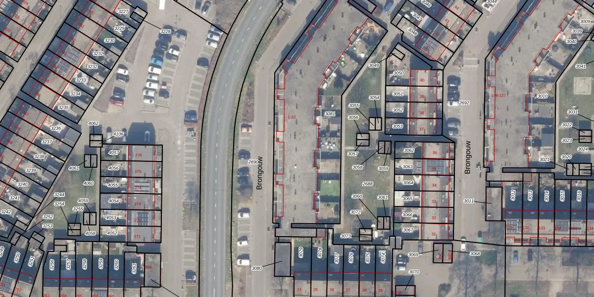 Het perceel waarop Brongouw 8 staat heeft een oppervlakte van 1855 m². Dit is een zeer groot perceel. De perceeloppervlakte wordt geregistreerd door het Kadaster. Gedetailleerde informatie over de maten van dit perceel kunt u vinden in het rapport Kadastrale kaart met maatvoering van Brongouw 8.