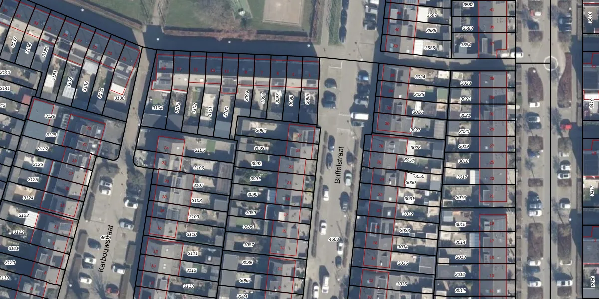 Het perceel waarop Buffelstraat 25 staat heeft een oppervlakte van 149 m². Dit is een middelgroot perceel. De perceeloppervlakte wordt geregistreerd door het Kadaster. Gedetailleerde informatie over de maten van dit perceel kunt u vinden in het rapport Kadastrale kaart met maatvoering van Buffelstraat 25.