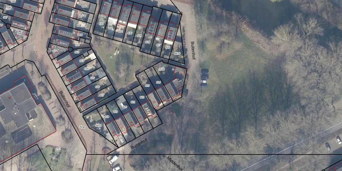 Het perceel waarop Buitenhof 21 staat heeft een oppervlakte van 262 m². Dit is een middelgroot perceel. De perceeloppervlakte wordt geregistreerd door het Kadaster. Gedetailleerde informatie over de maten van dit perceel kunt u vinden in het rapport Kadastrale kaart met maatvoering van Buitenhof 21.