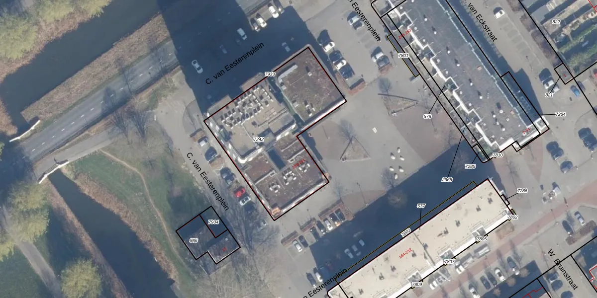C. van Eesterenplein 185 is gelegen op kadastraal perceel AMR04P7242. Deze kadastrale aanduiding is uniek en wordt gebruikt door het Kadaster om eigendomsrechten en andere zakelijke rechten vast te leggen. Het perceel maakt onderdeel uit van de kadastrale gemeente Almere.