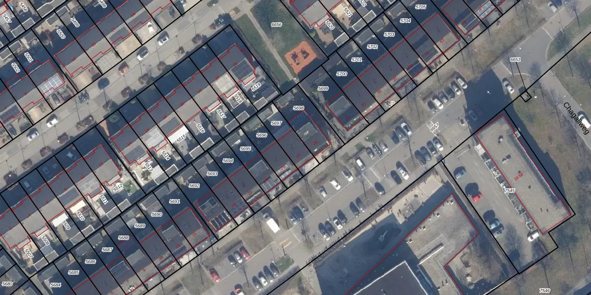 Het perceel waarop Chagallweg 27 staat heeft een oppervlakte van 185 m². Dit is een middelgroot perceel. De perceeloppervlakte wordt geregistreerd door het Kadaster. Gedetailleerde informatie over de maten van dit perceel kunt u vinden in het rapport Kadastrale kaart met maatvoering van Chagallweg 27.