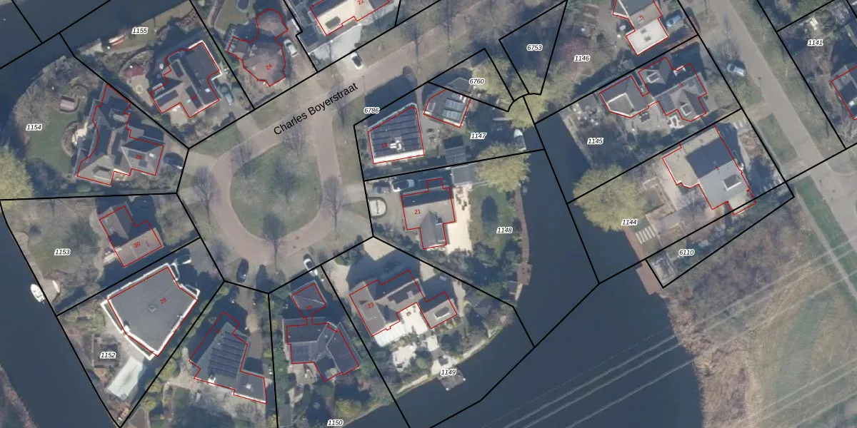 Het perceel waarop Charles Boyerstraat 21 staat heeft een oppervlakte van 1401 m². Dit is een zeer groot perceel. De perceeloppervlakte wordt geregistreerd door het Kadaster. Gedetailleerde informatie over de maten van dit perceel kunt u vinden in het rapport Kadastrale kaart met maatvoering van Charles Boyerstraat 21.