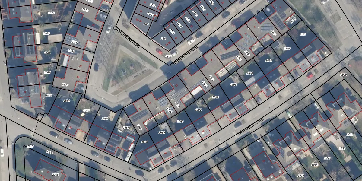 Het perceel waarop Chatelainestraat 13 staat heeft een oppervlakte van 218 m². Dit is een middelgroot perceel. De perceeloppervlakte wordt geregistreerd door het Kadaster. Gedetailleerde informatie over de maten van dit perceel kunt u vinden in het rapport Kadastrale kaart met maatvoering van Chatelainestraat 13.