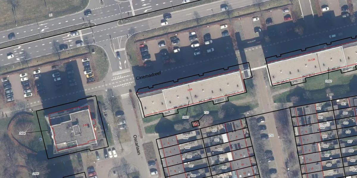 Het perceel waarop Cinemadreef 16 staat heeft een oppervlakte van 1031 m². Dit is een zeer groot perceel. De perceeloppervlakte wordt geregistreerd door het Kadaster. Gedetailleerde informatie over de maten van dit perceel kunt u vinden in het rapport Kadastrale kaart met maatvoering van Cinemadreef 16.