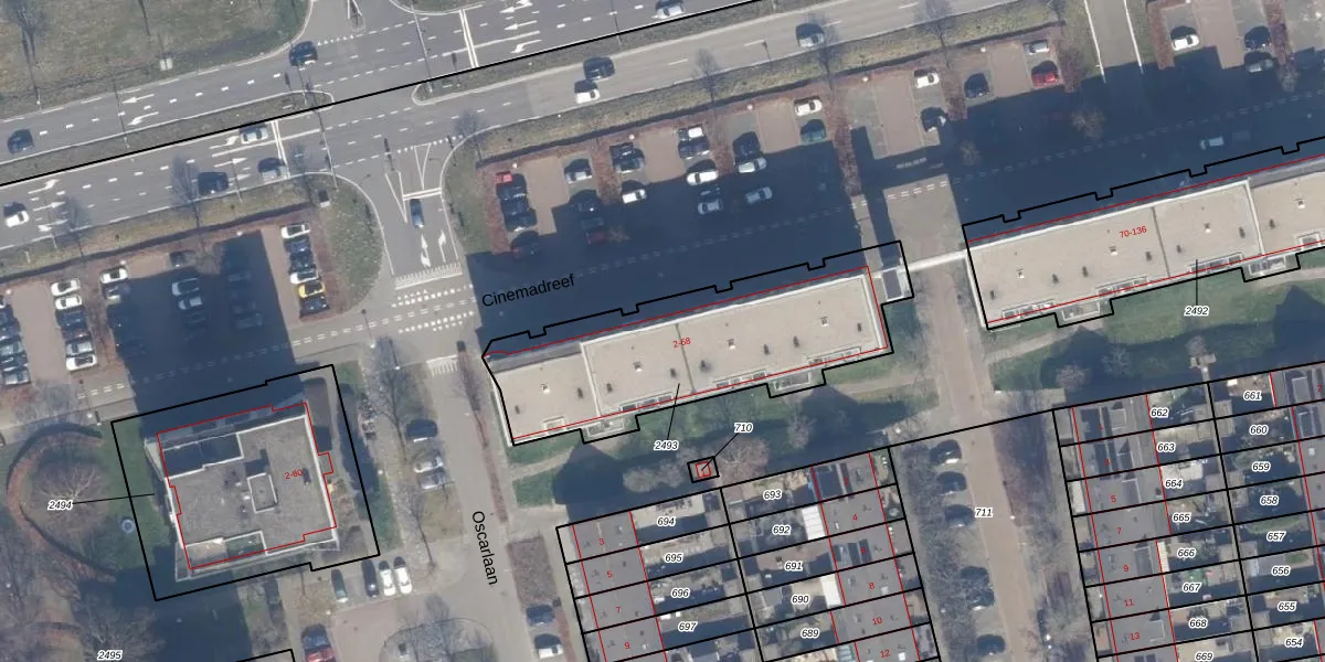 Het perceel waarop Cinemadreef 20 staat heeft een oppervlakte van 1031 m². Dit is een zeer groot perceel. De perceeloppervlakte wordt geregistreerd door het Kadaster. Gedetailleerde informatie over de maten van dit perceel kunt u vinden in het rapport Kadastrale kaart met maatvoering van Cinemadreef 20.