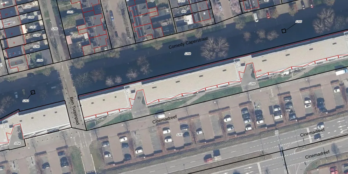 Het perceel waarop Cinemadreef 319 staat heeft een oppervlakte van 4455 m². Dit is een zeer groot perceel. De perceeloppervlakte wordt geregistreerd door het Kadaster. Gedetailleerde informatie over de maten van dit perceel kunt u vinden in het rapport Kadastrale kaart met maatvoering van Cinemadreef 319.