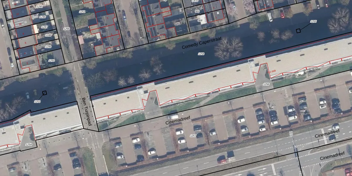 Het perceel waarop Cinemadreef 365 staat heeft een oppervlakte van 4455 m². Dit is een zeer groot perceel. De perceeloppervlakte wordt geregistreerd door het Kadaster. Gedetailleerde informatie over de maten van dit perceel kunt u vinden in het rapport Kadastrale kaart met maatvoering van Cinemadreef 365.