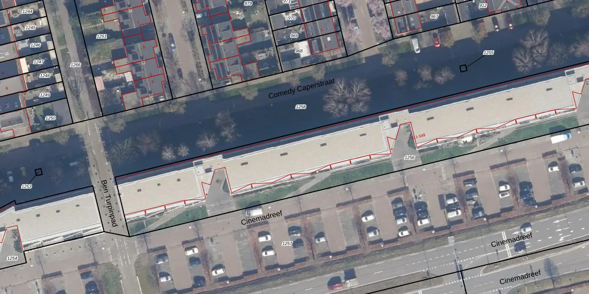Het perceel waarop Cinemadreef 385 staat heeft een oppervlakte van 4455 m². Dit is een zeer groot perceel. De perceeloppervlakte wordt geregistreerd door het Kadaster. Gedetailleerde informatie over de maten van dit perceel kunt u vinden in het rapport Kadastrale kaart met maatvoering van Cinemadreef 385.
