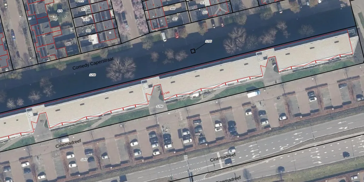 Het perceel waarop Cinemadreef 405 staat heeft een oppervlakte van 4455 m². Dit is een zeer groot perceel. De perceeloppervlakte wordt geregistreerd door het Kadaster. Gedetailleerde informatie over de maten van dit perceel kunt u vinden in het rapport Kadastrale kaart met maatvoering van Cinemadreef 405.