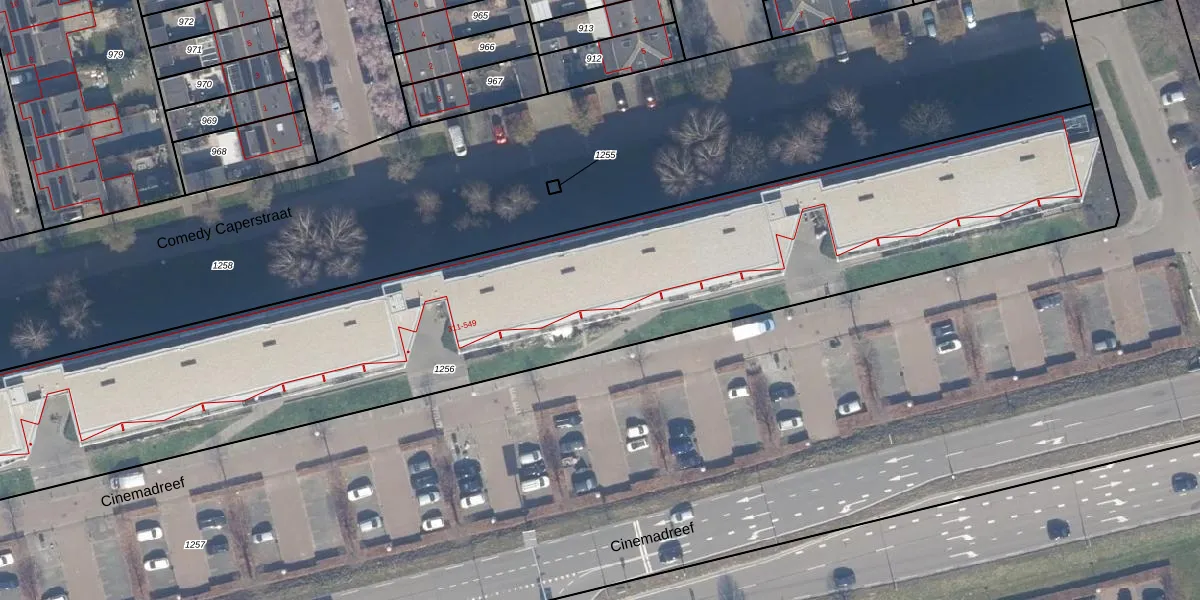 Het perceel waarop Cinemadreef 409 staat heeft een oppervlakte van 4455 m². Dit is een zeer groot perceel. De perceeloppervlakte wordt geregistreerd door het Kadaster. Gedetailleerde informatie over de maten van dit perceel kunt u vinden in het rapport Kadastrale kaart met maatvoering van Cinemadreef 409.