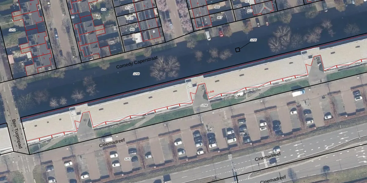 Het perceel waarop Cinemadreef 433 staat heeft een oppervlakte van 4455 m². Dit is een zeer groot perceel. De perceeloppervlakte wordt geregistreerd door het Kadaster. Gedetailleerde informatie over de maten van dit perceel kunt u vinden in het rapport Kadastrale kaart met maatvoering van Cinemadreef 433.