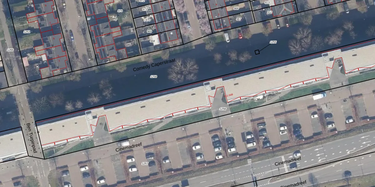 Het perceel waarop Cinemadreef 447 staat heeft een oppervlakte van 4455 m². Dit is een zeer groot perceel. De perceeloppervlakte wordt geregistreerd door het Kadaster. Gedetailleerde informatie over de maten van dit perceel kunt u vinden in het rapport Kadastrale kaart met maatvoering van Cinemadreef 447.