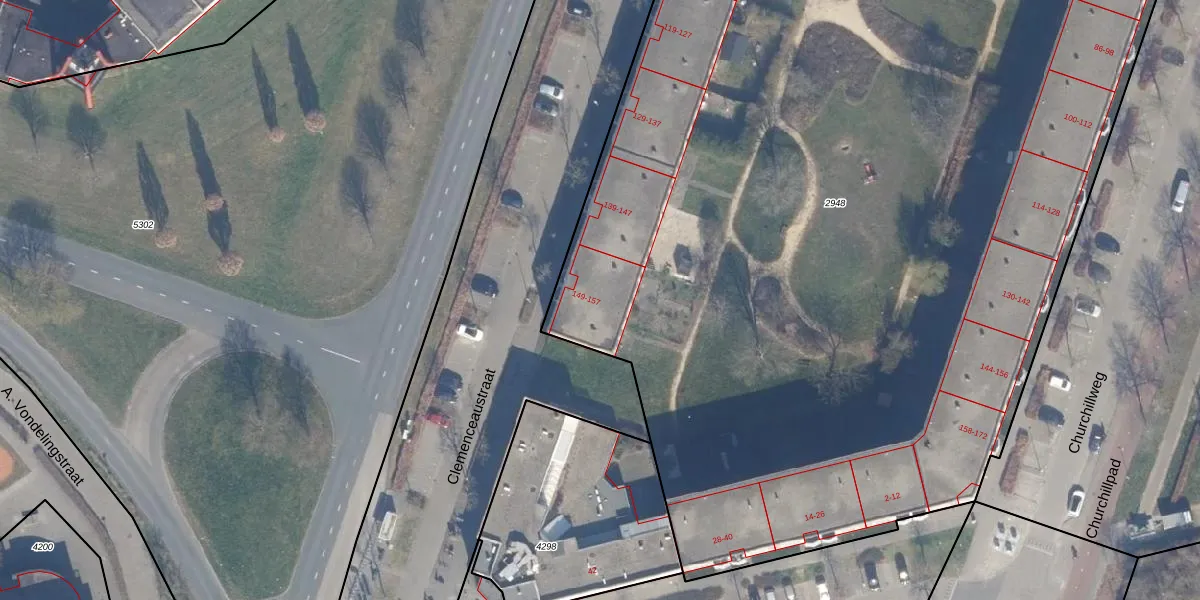 Het perceel waarop Clemenceaustraat 151 staat heeft een oppervlakte van 8761 m². Dit is een zeer groot perceel. De perceeloppervlakte wordt geregistreerd door het Kadaster. Gedetailleerde informatie over de maten van dit perceel kunt u vinden in het rapport Kadastrale kaart met maatvoering van Clemenceaustraat 151.