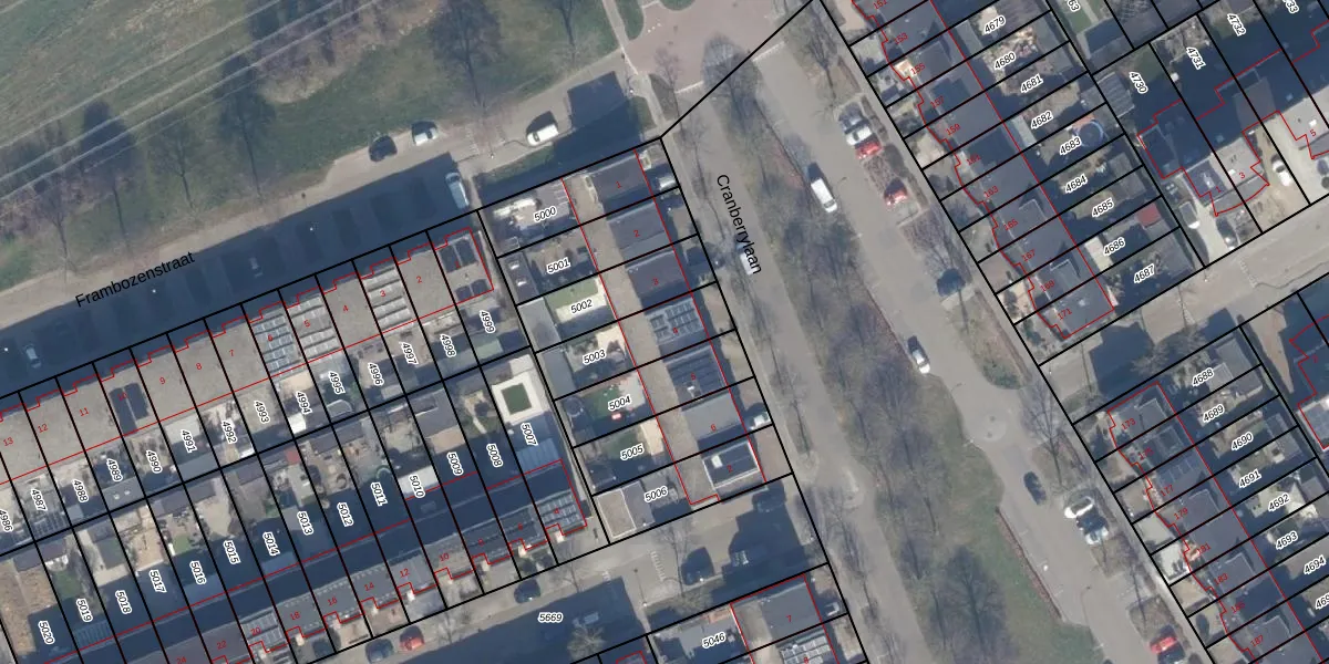 Cranberrylaan 4 is gelegen op kadastraal perceel AMR04U5003. Deze kadastrale aanduiding is uniek en wordt gebruikt door het Kadaster om eigendomsrechten en andere zakelijke rechten vast te leggen. Het perceel maakt onderdeel uit van de kadastrale gemeente Almere.