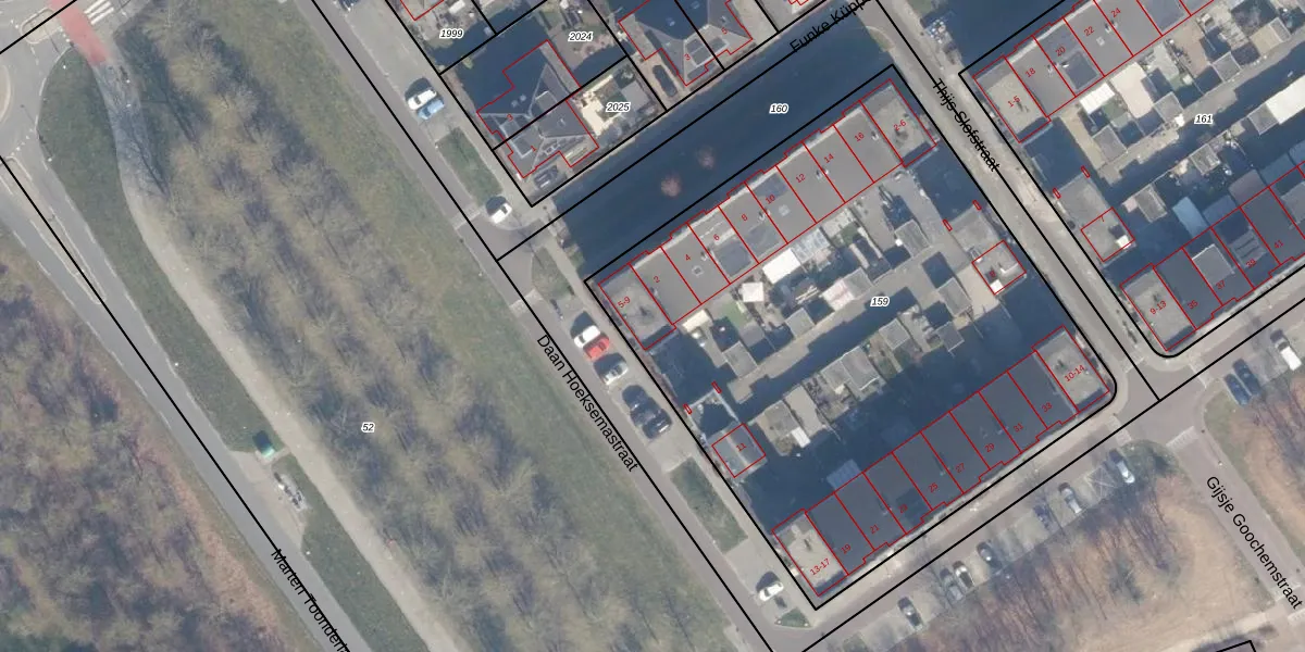 Het perceel waarop Daan Hoeksemastraat 9 staat heeft een oppervlakte van 3555 m². Dit is een zeer groot perceel. De perceeloppervlakte wordt geregistreerd door het Kadaster. Gedetailleerde informatie over de maten van dit perceel kunt u vinden in het rapport Kadastrale kaart met maatvoering van Daan Hoeksemastraat 9.