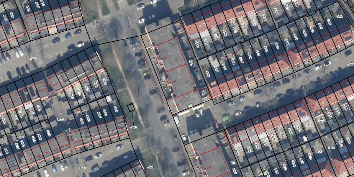 Het adres is gelegen op perceel 4421 in de sectie U en de kadastrale gemeente Almere. De kadastrale aanduiding is aldus AMR04-U-4421. Het perceel is kleiner dan gemiddeld in Almere. Het perceel is 1167 m² groot, terwijl het gemiddelde ligt op 3329,36 m². De grootste perceeloppervlakte in de kadastrale gemeente is 32,12 km². De kleinste oppervlakte bedraagt 0 m². Op het perceel zijn 22 adressen aanwezig. De huidige grenzen van het perceel zijn digitaal in de Basisregistratie Kadaster (BRK) geregistreerd op 28-06-1999.