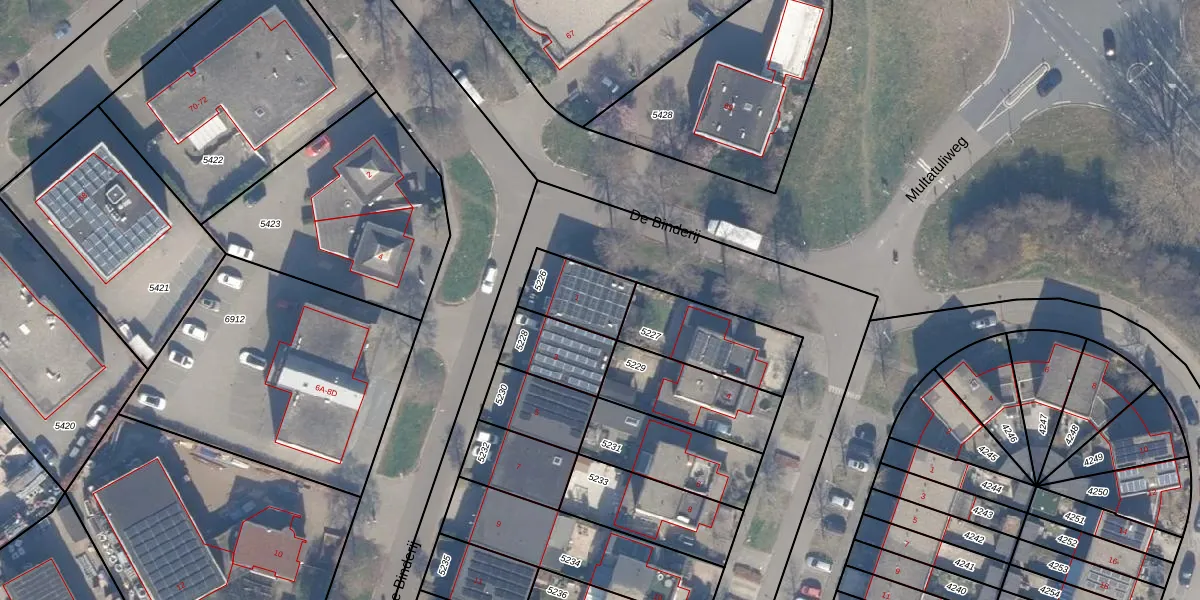 De Binderij 1 is gelegen op kadastraal perceel AMR04Q5226. Deze kadastrale aanduiding is uniek en wordt gebruikt door het Kadaster om eigendomsrechten en andere zakelijke rechten vast te leggen. Het perceel maakt onderdeel uit van de kadastrale gemeente Almere.