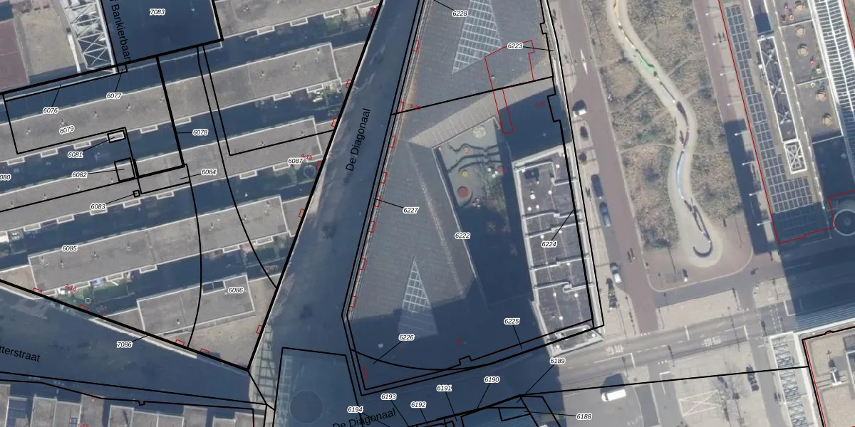 Het perceel waarop De Diagonaal 23 staat heeft een oppervlakte van 2887 m². Dit is een zeer groot perceel. De perceeloppervlakte wordt geregistreerd door het Kadaster. Gedetailleerde informatie over de maten van dit perceel kunt u vinden in het rapport Kadastrale kaart met maatvoering van De Diagonaal 23.
