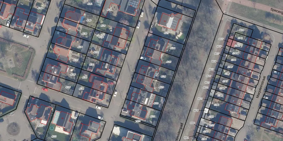 Het perceel waarop De Specerij 39 staat heeft een oppervlakte van 266 m². Dit is een middelgroot perceel. De perceeloppervlakte wordt geregistreerd door het Kadaster. Gedetailleerde informatie over de maten van dit perceel kunt u vinden in het rapport Kadastrale kaart met maatvoering van De Specerij 39.