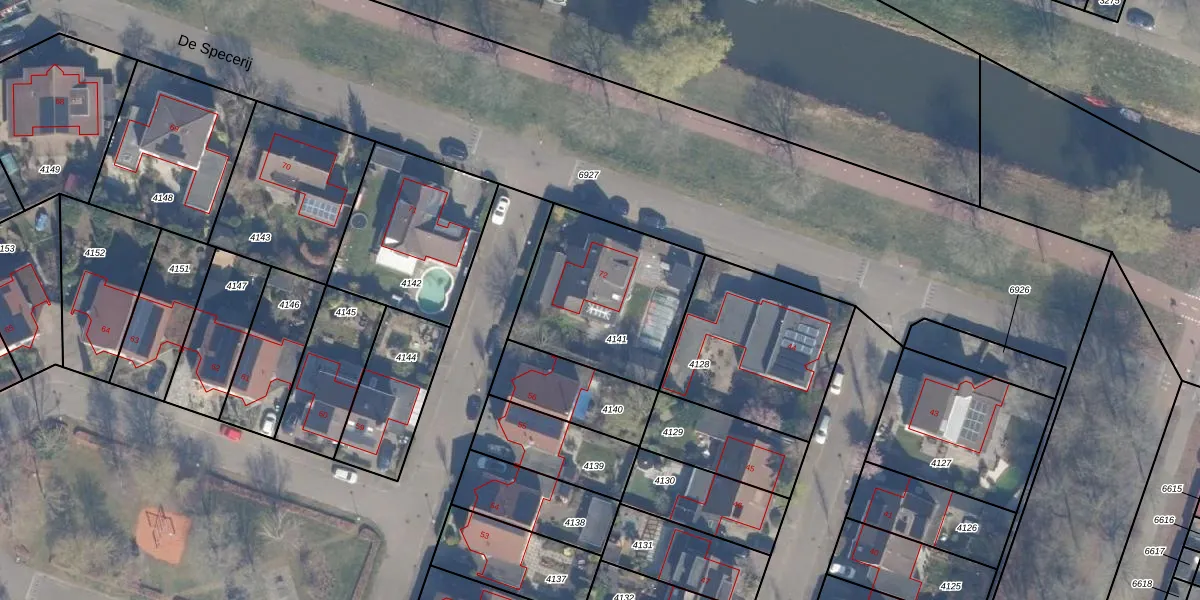 Het perceel waarop De Specerij 72 staat heeft een oppervlakte van 639 m². Dit is een groot perceel. De perceeloppervlakte wordt geregistreerd door het Kadaster. Gedetailleerde informatie over de maten van dit perceel kunt u vinden in het rapport Kadastrale kaart met maatvoering van De Specerij 72.