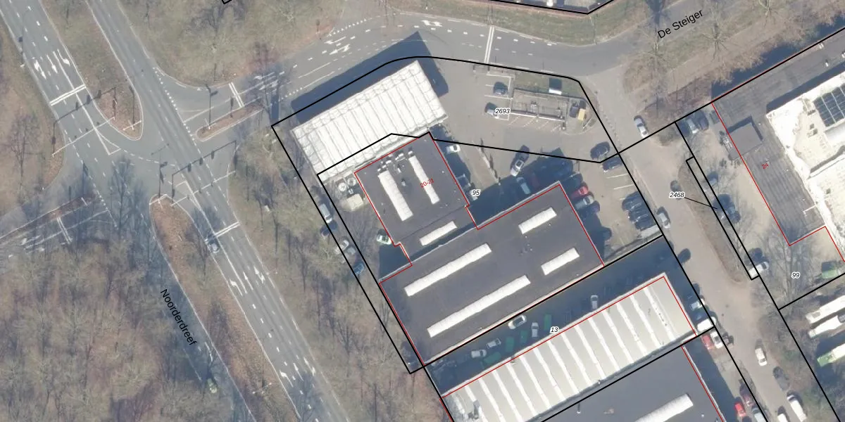 Het perceel waarop De Steiger 21 staat heeft een oppervlakte van 2633 m². Dit is een zeer groot perceel. De perceeloppervlakte wordt geregistreerd door het Kadaster. Gedetailleerde informatie over de maten van dit perceel kunt u vinden in het rapport Kadastrale kaart met maatvoering van De Steiger 21.