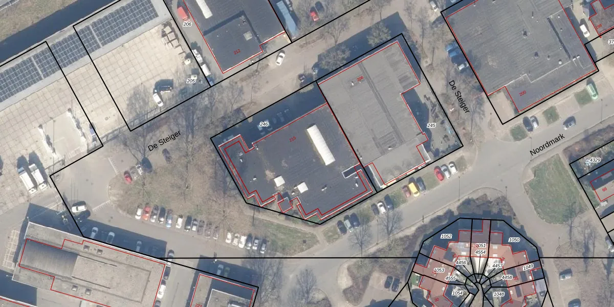 Het perceel waarop De Steiger 215 staat heeft een oppervlakte van 1471 m². Dit is een zeer groot perceel. De perceeloppervlakte wordt geregistreerd door het Kadaster. Gedetailleerde informatie over de maten van dit perceel kunt u vinden in het rapport Kadastrale kaart met maatvoering van De Steiger 215.