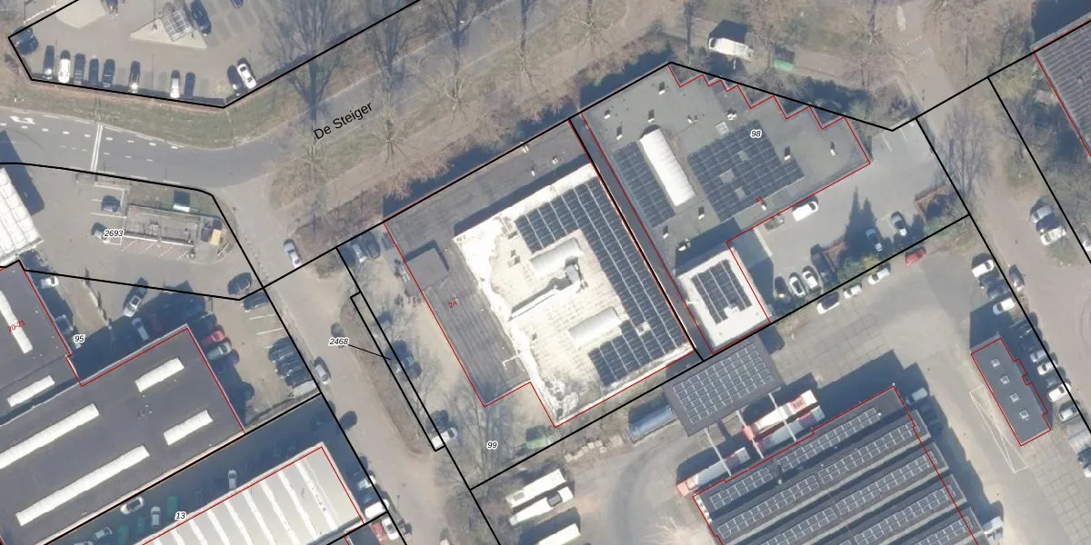 Het perceel waarop De Steiger 24 staat heeft een oppervlakte van 2486 m². Dit is een zeer groot perceel. De perceeloppervlakte wordt geregistreerd door het Kadaster. Gedetailleerde informatie over de maten van dit perceel kunt u vinden in het rapport Kadastrale kaart met maatvoering van De Steiger 24.