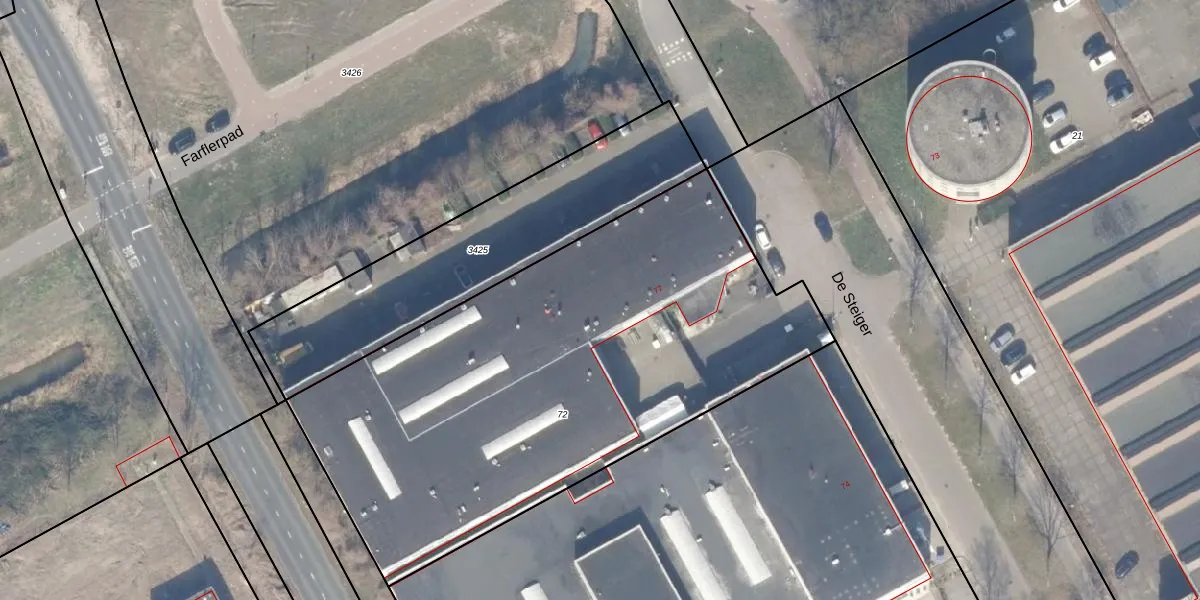 Het perceel waarop De Steiger 75-G-135 staat heeft een oppervlakte van 2896 m². Dit is een zeer groot perceel. De perceeloppervlakte wordt geregistreerd door het Kadaster. Gedetailleerde informatie over de maten van dit perceel kunt u vinden in het rapport Kadastrale kaart met maatvoering van De Steiger 75-G-135.