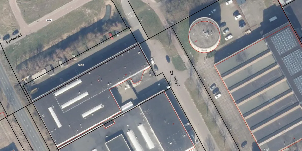 Het perceel waarop De Steiger 75-G-90 staat heeft een oppervlakte van 2896 m². Dit is een zeer groot perceel. De perceeloppervlakte wordt geregistreerd door het Kadaster. Gedetailleerde informatie over de maten van dit perceel kunt u vinden in het rapport Kadastrale kaart met maatvoering van De Steiger 75-G-90.