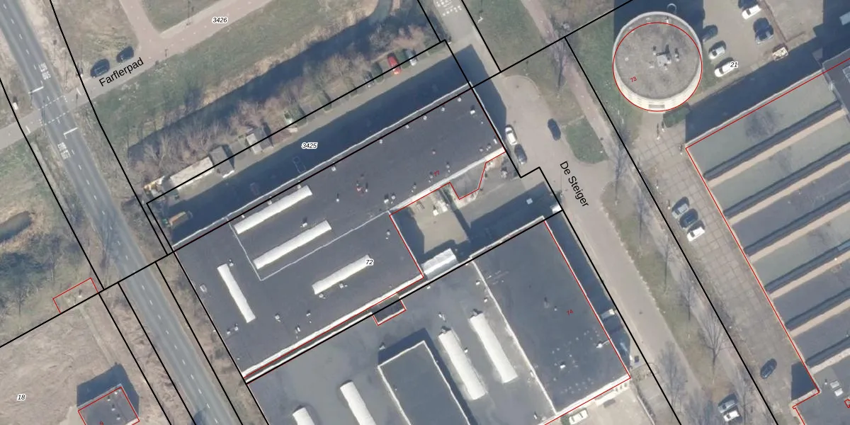 Het perceel waarop De Steiger 75-G-100 staat heeft een oppervlakte van 2896 m². Dit is een zeer groot perceel. De perceeloppervlakte wordt geregistreerd door het Kadaster. Gedetailleerde informatie over de maten van dit perceel kunt u vinden in het rapport Kadastrale kaart met maatvoering van De Steiger 75-G-100.