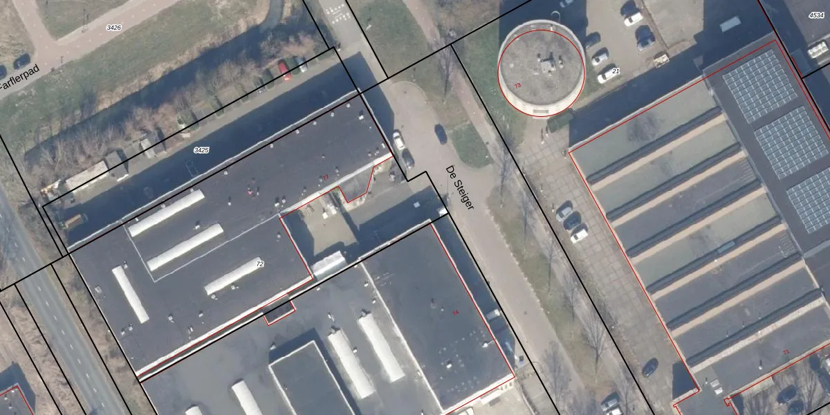 Het perceel waarop De Steiger 75-G-190 staat heeft een oppervlakte van 2896 m². Dit is een zeer groot perceel. De perceeloppervlakte wordt geregistreerd door het Kadaster. Gedetailleerde informatie over de maten van dit perceel kunt u vinden in het rapport Kadastrale kaart met maatvoering van De Steiger 75-G-190.