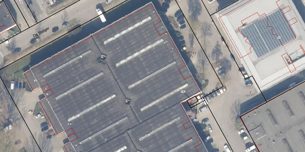 Het perceel waarop De Steiger 87 staat heeft een oppervlakte van 2,0 ha. Dit is een zeer groot perceel. De perceeloppervlakte wordt geregistreerd door het Kadaster. Gedetailleerde informatie over de maten van dit perceel kunt u vinden in het rapport Kadastrale kaart met maatvoering van De Steiger 87.