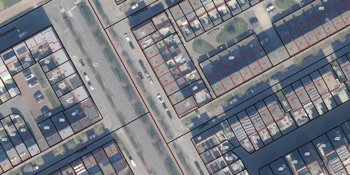 Het perceel waarop Dek 24 staat heeft een oppervlakte van 664 m². Dit is een groot perceel. De perceeloppervlakte wordt geregistreerd door het Kadaster. Gedetailleerde informatie over de maten van dit perceel kunt u vinden in het rapport Kadastrale kaart met maatvoering van Dek 24.