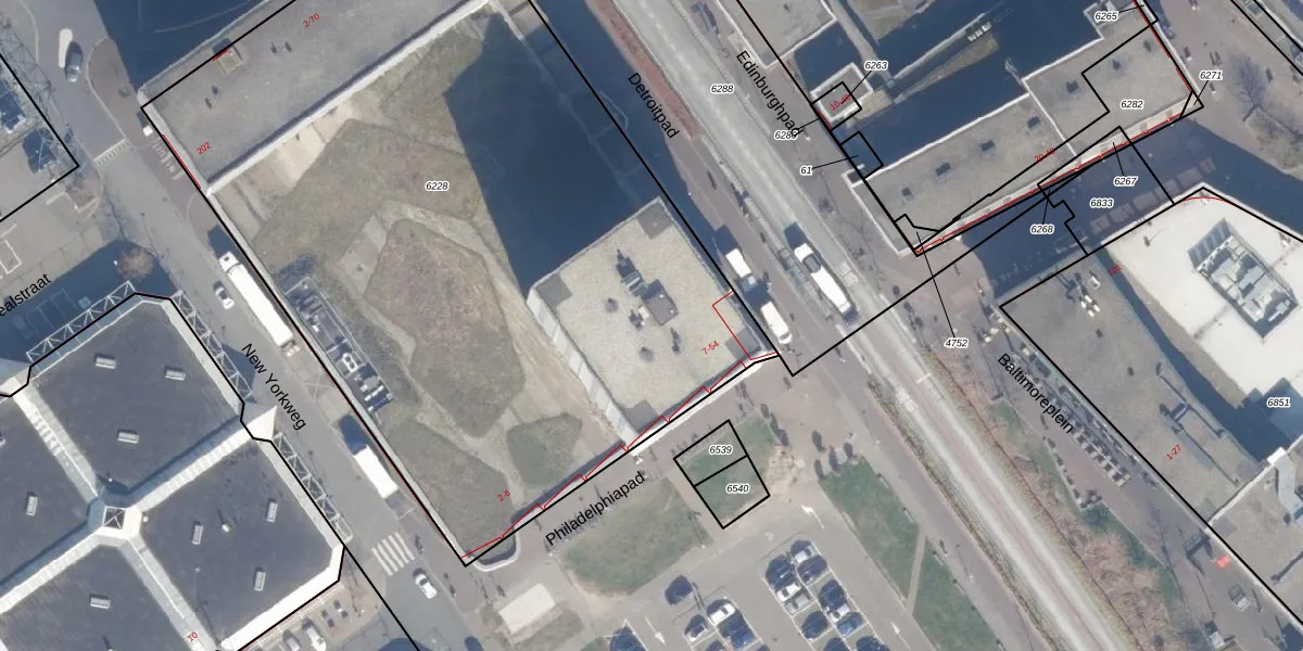 Het perceel waarop Detroitpad 25 staat heeft een oppervlakte van 5015 m². Dit is een zeer groot perceel. De perceeloppervlakte wordt geregistreerd door het Kadaster. Gedetailleerde informatie over de maten van dit perceel kunt u vinden in het rapport Kadastrale kaart met maatvoering van Detroitpad 25.