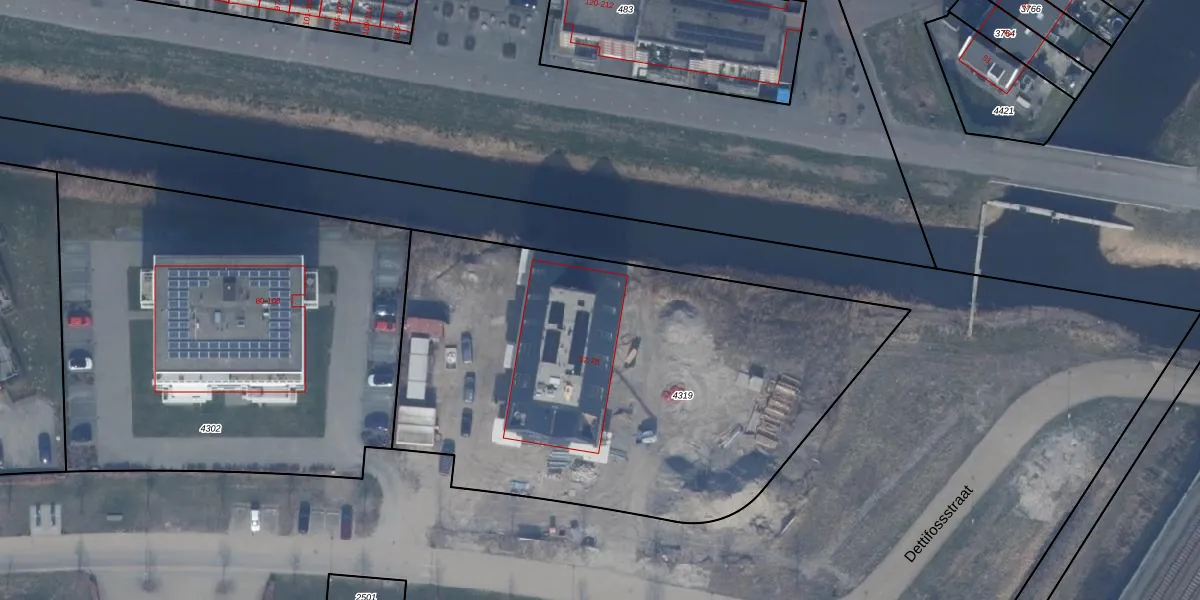 Het perceel waarop Dettifossstraat 72 staat heeft een oppervlakte van 2845 m². Dit is een zeer groot perceel. De perceeloppervlakte wordt geregistreerd door het Kadaster. Gedetailleerde informatie over de maten van dit perceel kunt u vinden in het rapport Kadastrale kaart met maatvoering van Dettifossstraat 72.