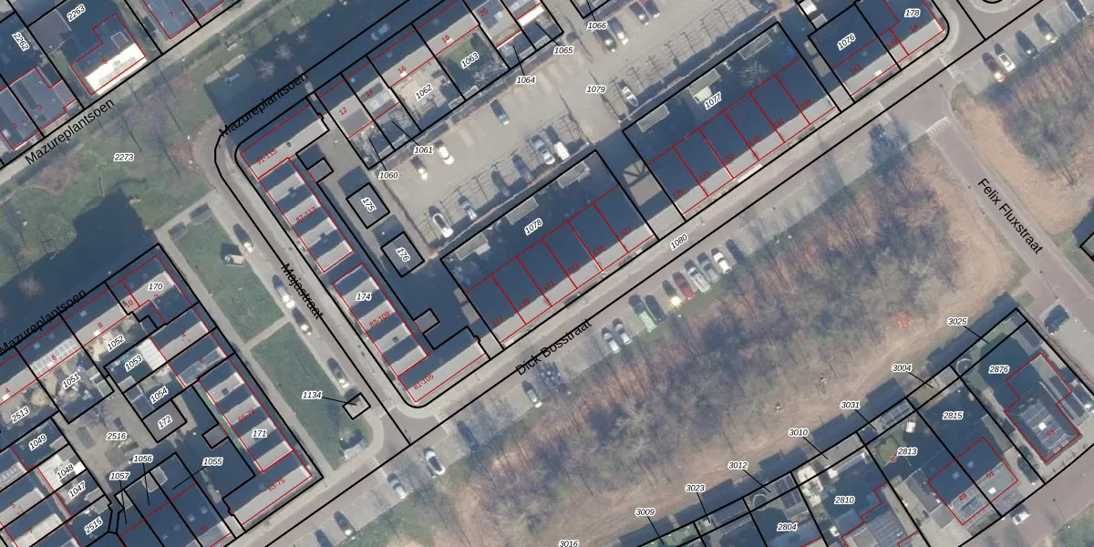 Het perceel waarop Dick Bosstraat 121 staat heeft een oppervlakte van 702 m². Dit is een groot perceel. De perceeloppervlakte wordt geregistreerd door het Kadaster. Gedetailleerde informatie over de maten van dit perceel kunt u vinden in het rapport Kadastrale kaart met maatvoering van Dick Bosstraat 121.